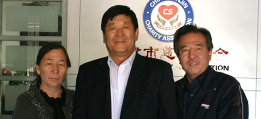 2009荣耀体育(中国)集团董事长崔洪金为阿依努尔捐款10万元,阿依努尔的母亲、舅舅与董事长崔洪金合影