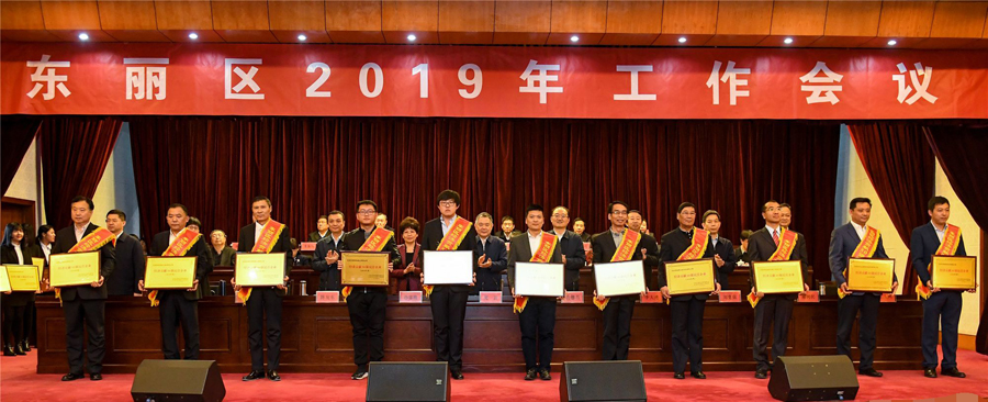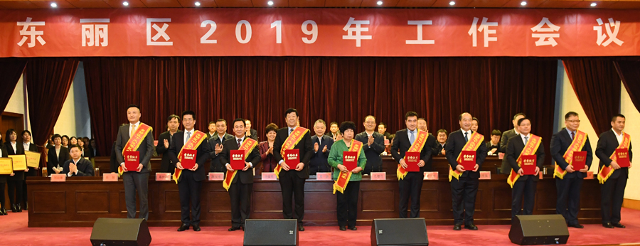 2月20日下午,我区召开2019年工作会议,认真贯彻习近平新时代中国特色社会主义思想和党的十九大精神,深入落实习近平总书记在天津考察工作和京津冀协同发展座谈会上的重要讲话精神,按照市委十一届五次全会和区委十一届九次全会要求,对今年全区各项重点工作任务进行再动员、再部署,进一步统一思想、凝心聚力,顽强拼搏、扎实苦干,奋力开启东丽绿色高质量发展新征程,推动美丽东丽建设再上新水平。区委书记夏新,区委副书记、区长孔德昌,区人大常委会主任孙富霞,区政协主席李大勇等区领导出席,荣耀体育(中国)集团党委书记董事长崔洪金作为十大优秀民营企业家之一参会并上台领奖。