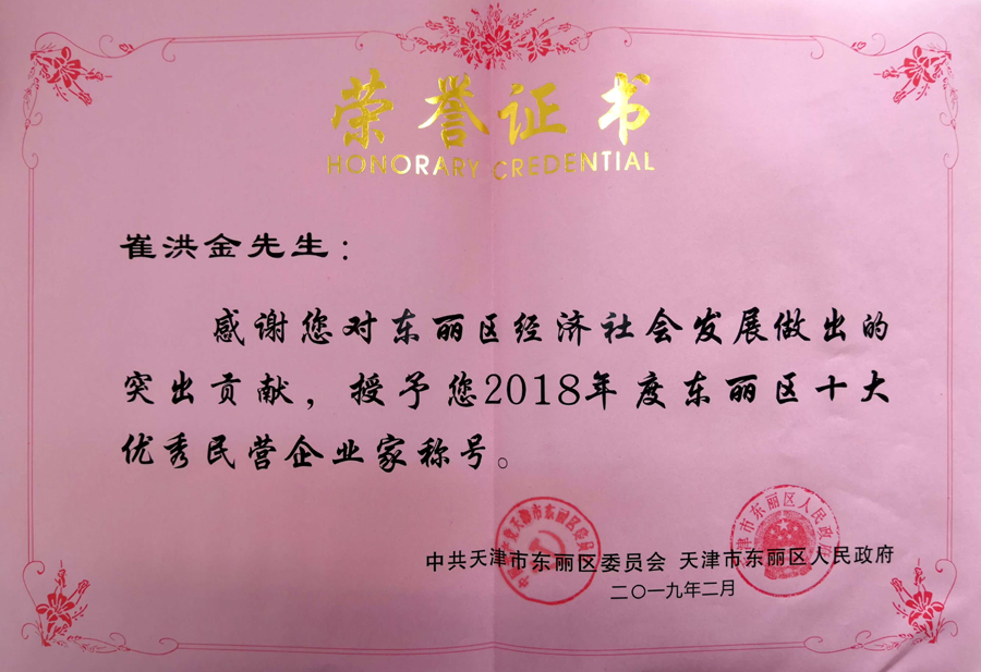 荣耀体育(中国)集团党委书记、董事长崔洪金荣获2018年度东丽区十大优秀民营企业家并颁发证书。